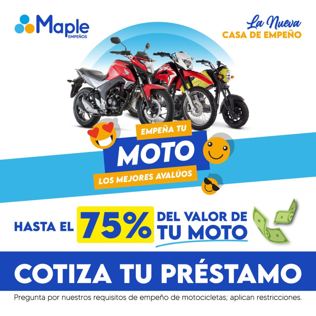 En Maple Empeños, ofrecemos la mejor solución si necesitas dinero rápido y tienes una moto o carro que puedes empeñar. Aceptamos todas las marcas de vehículos, motos del año 2016 en adelante y carros del 2004 en adelante. Nuestro proceso es rápido, seguro y transparente, para que puedas obtener el efectivo que necesitas sin perder tu vehículo.